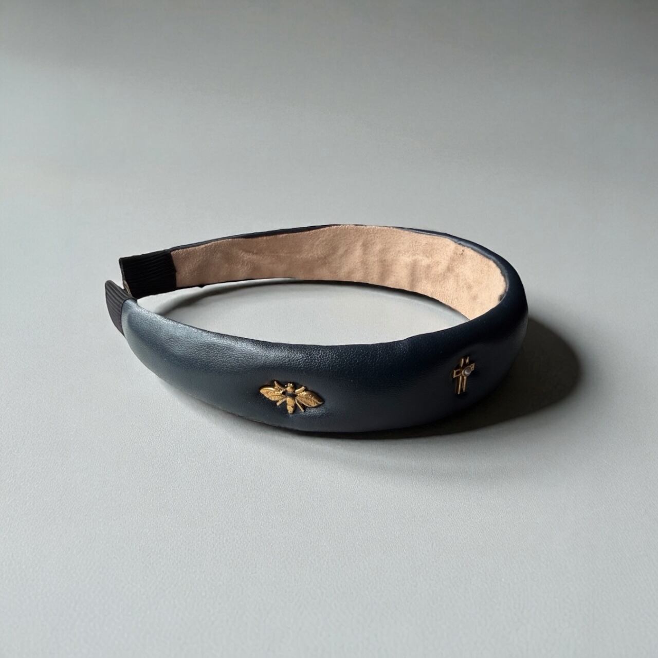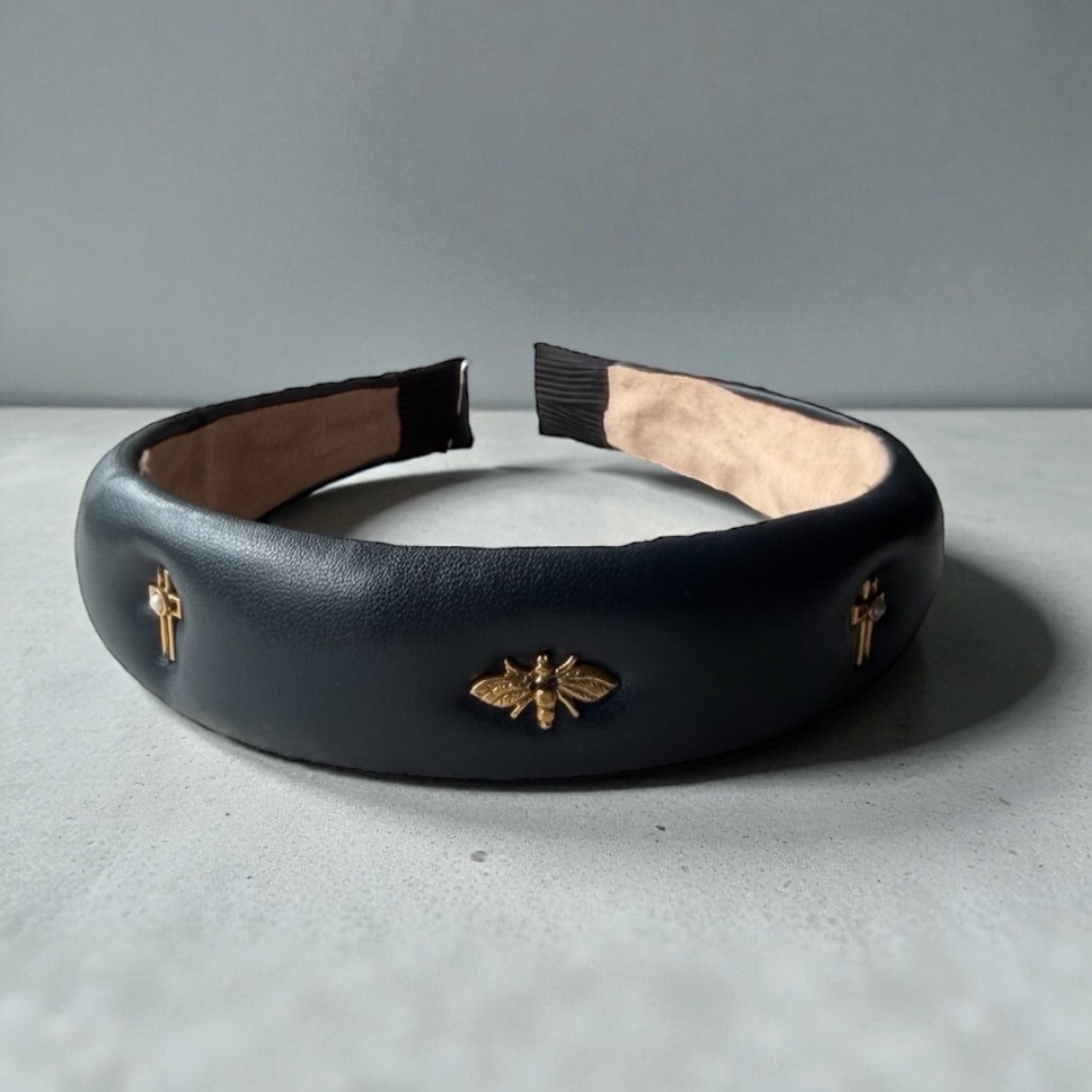 ゴールドの蜂とクロスモチーフが付いたカチューシャ。